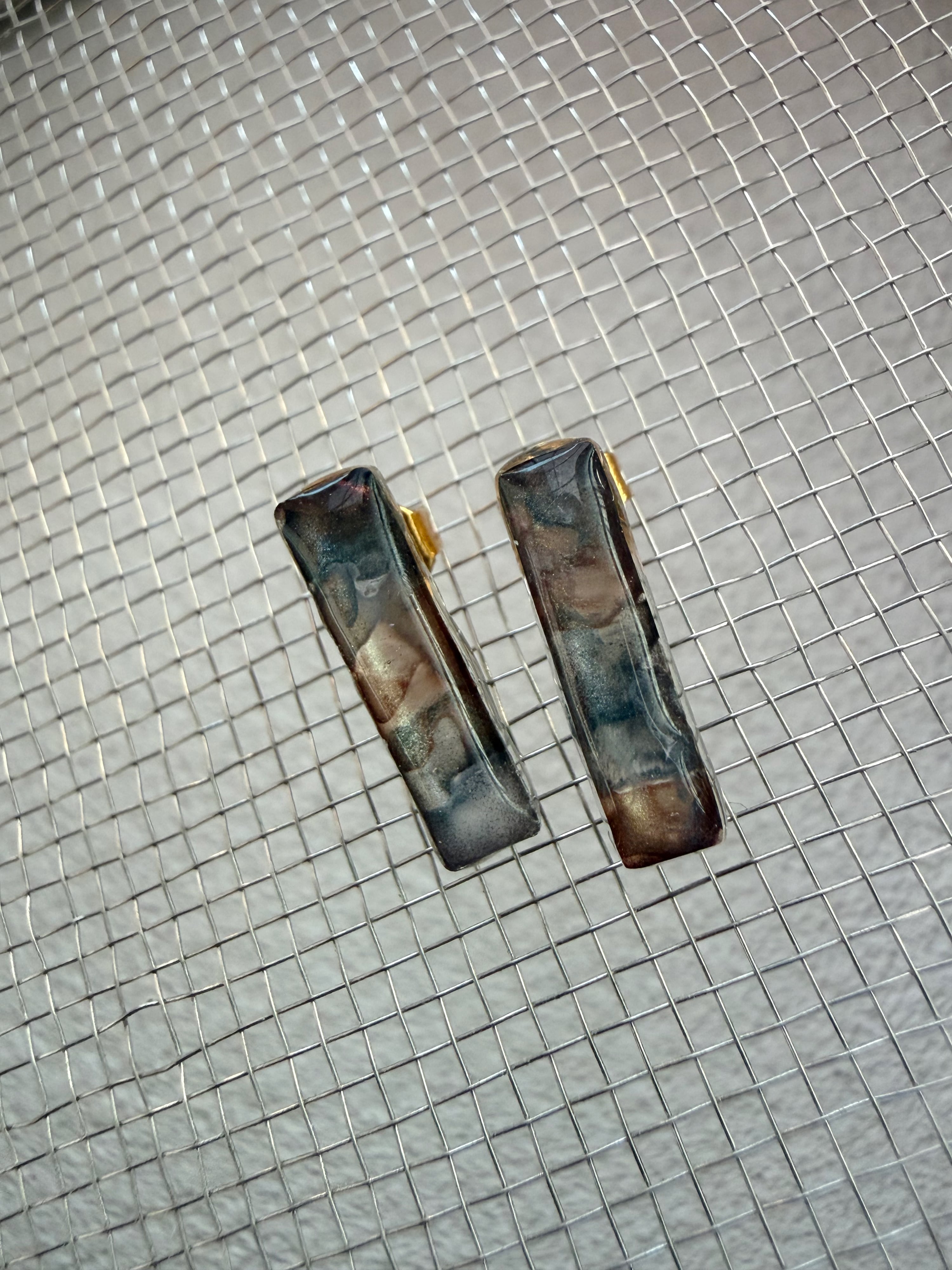 ブラウン系カラーが混ざり合う奥深いデザインが特徴の、ドロップ型レジンピアス。