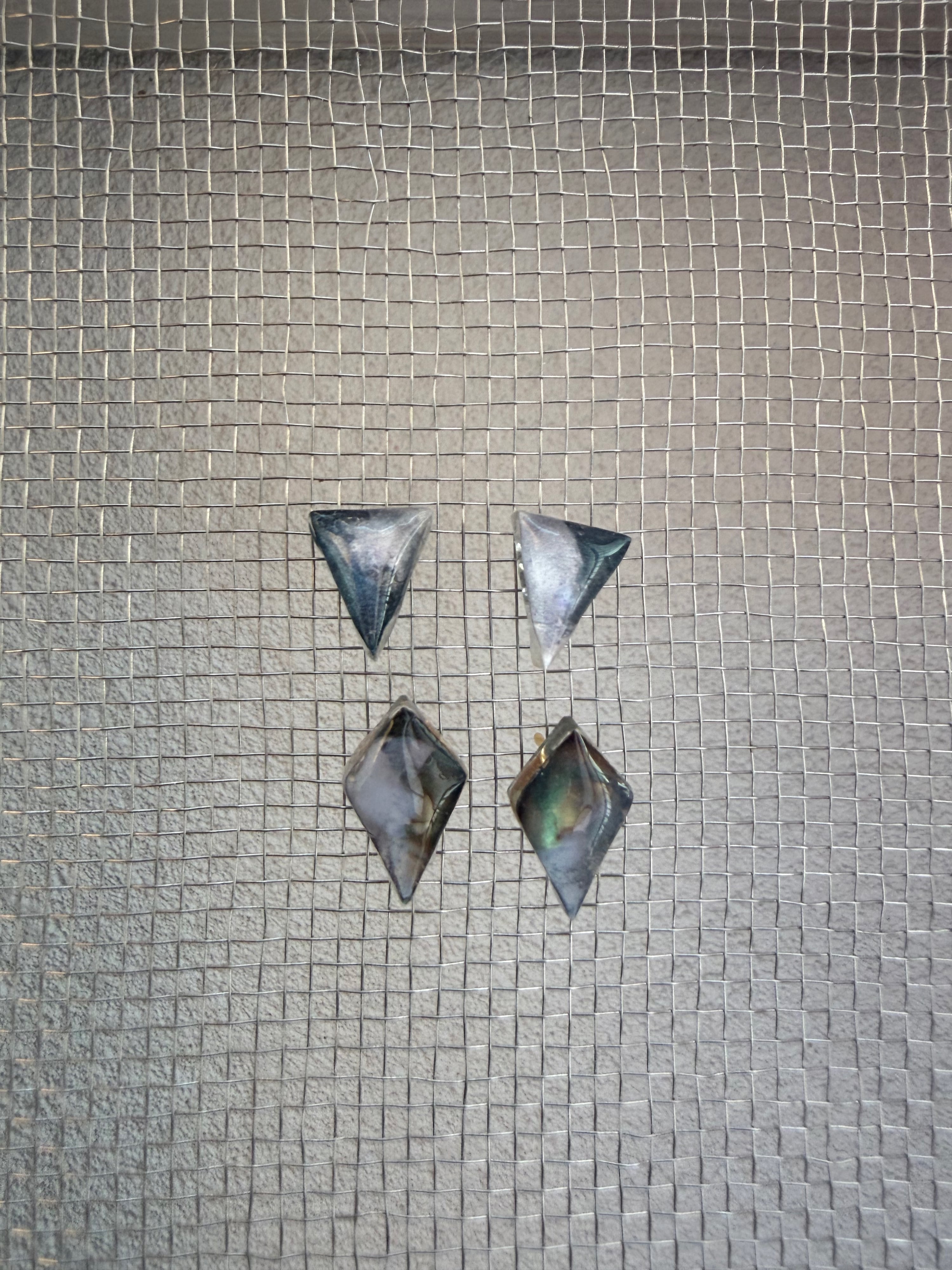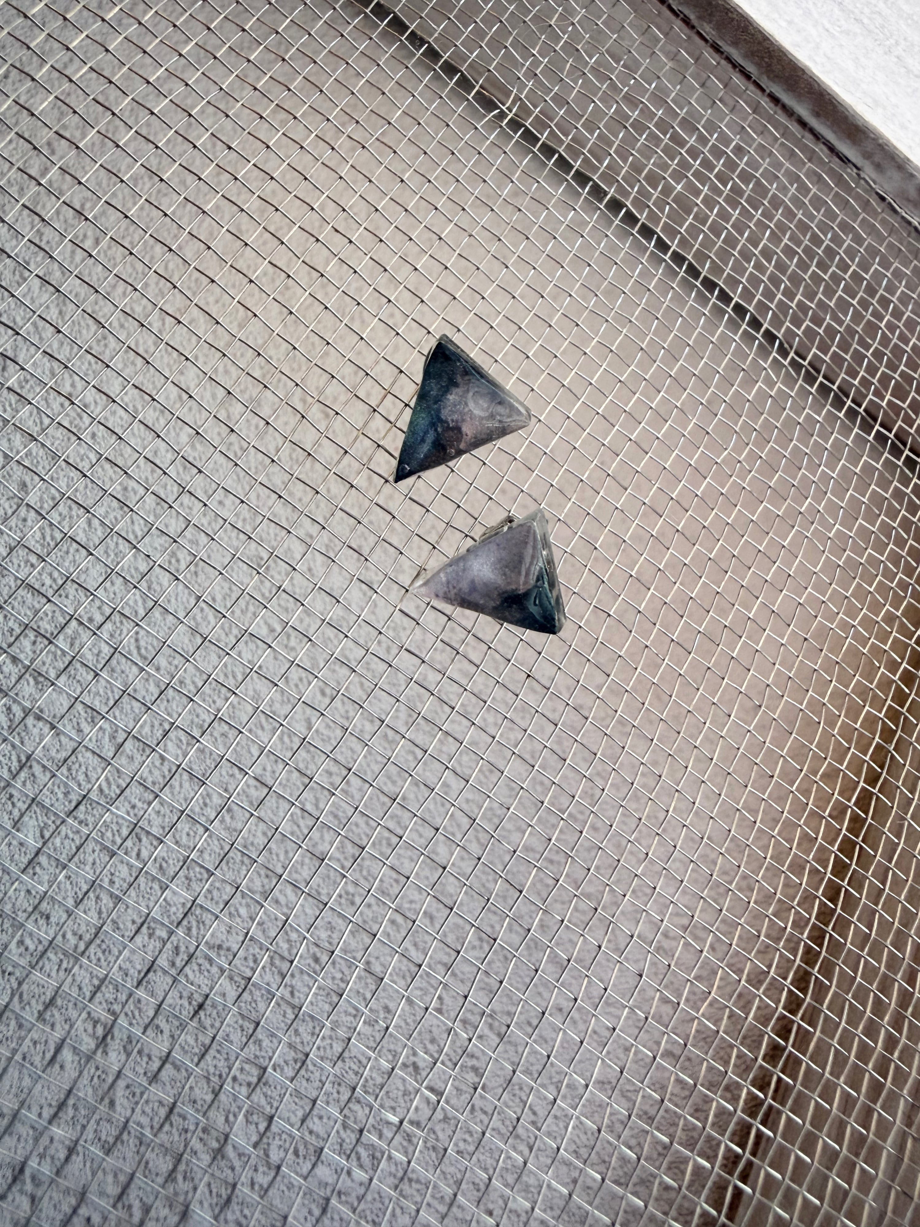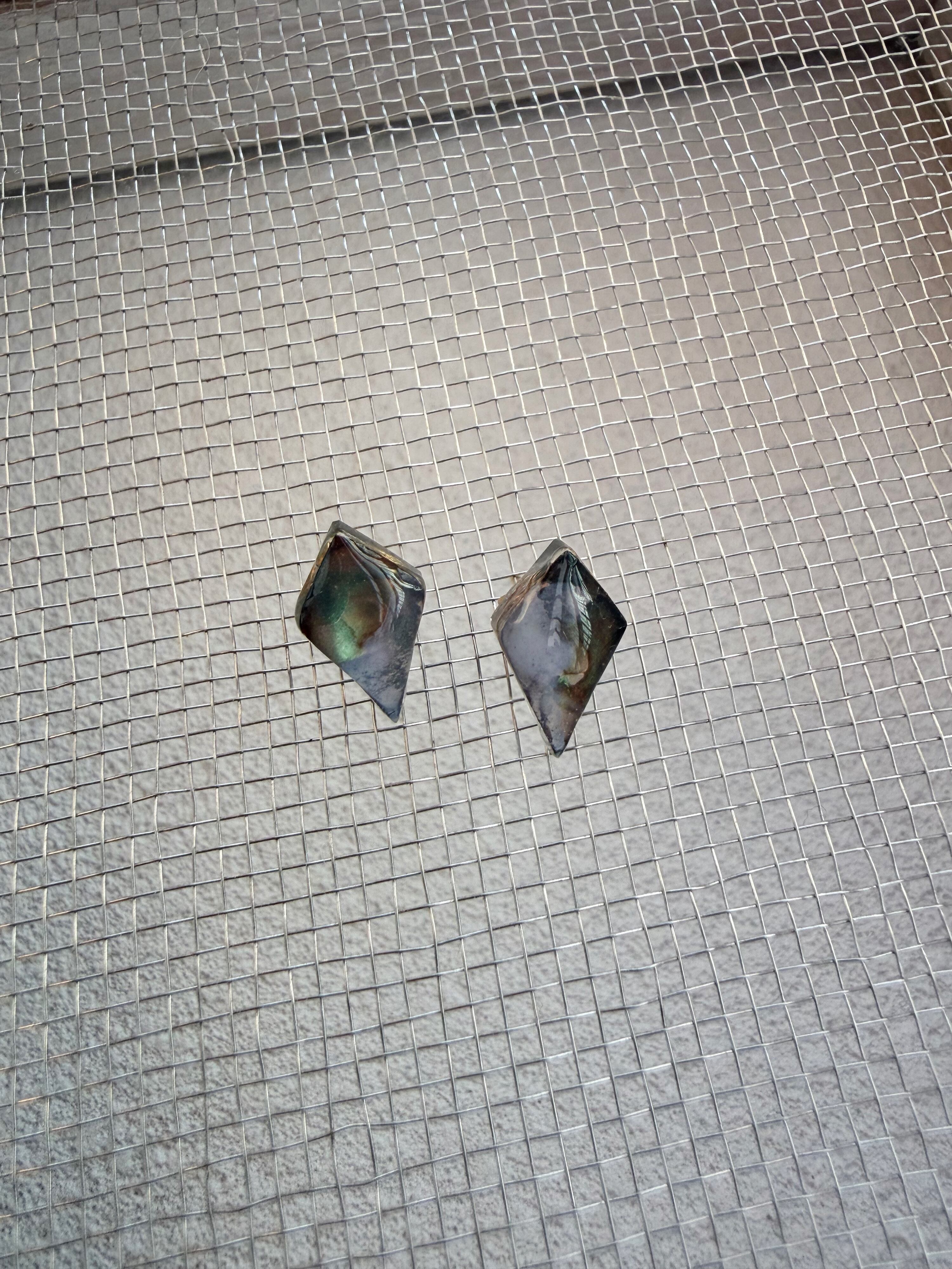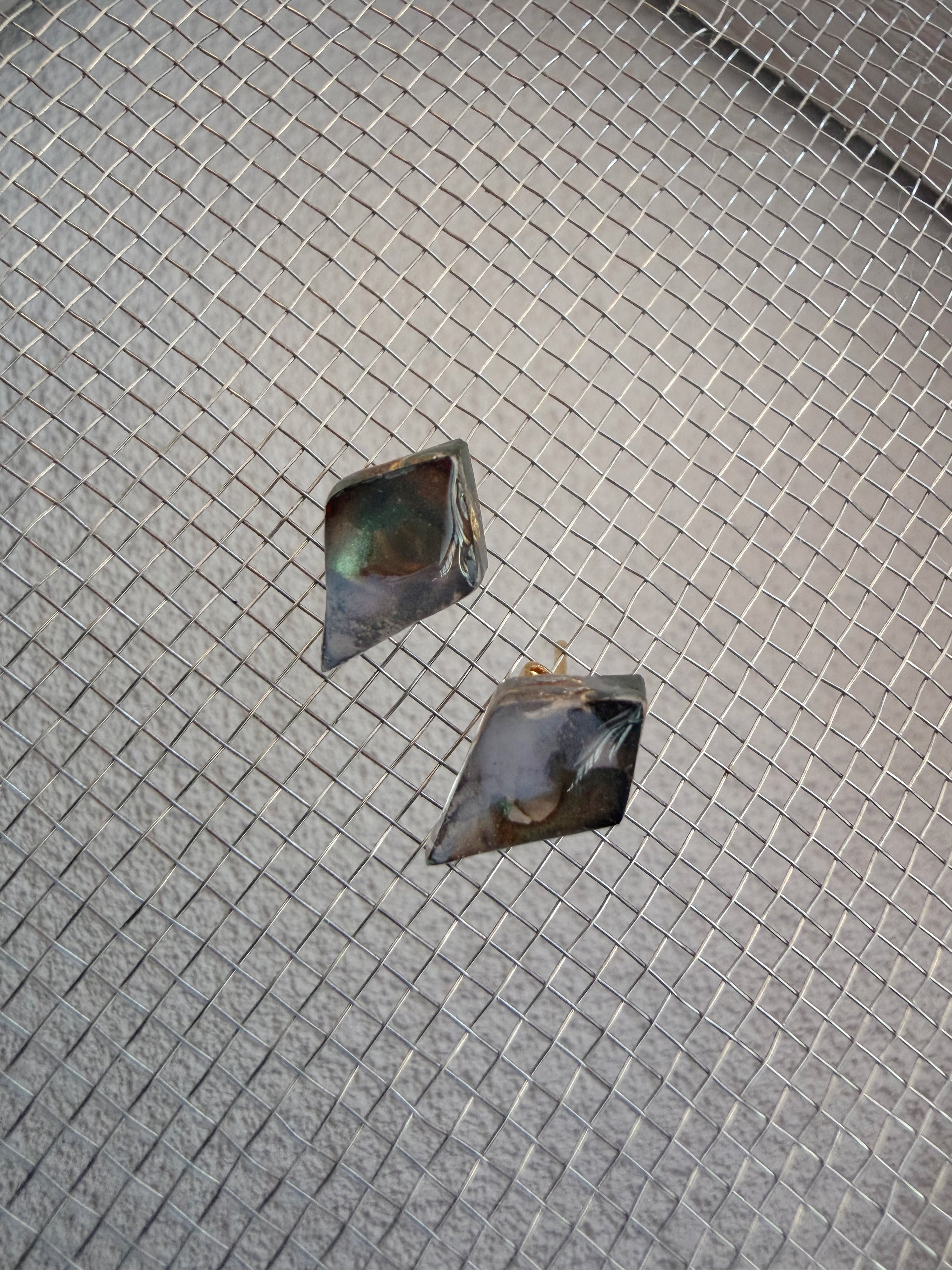 ブルー×グリーン系カラーが混ざり合う奥深いデザインが特徴の、ドロップ型レジンピアス。
