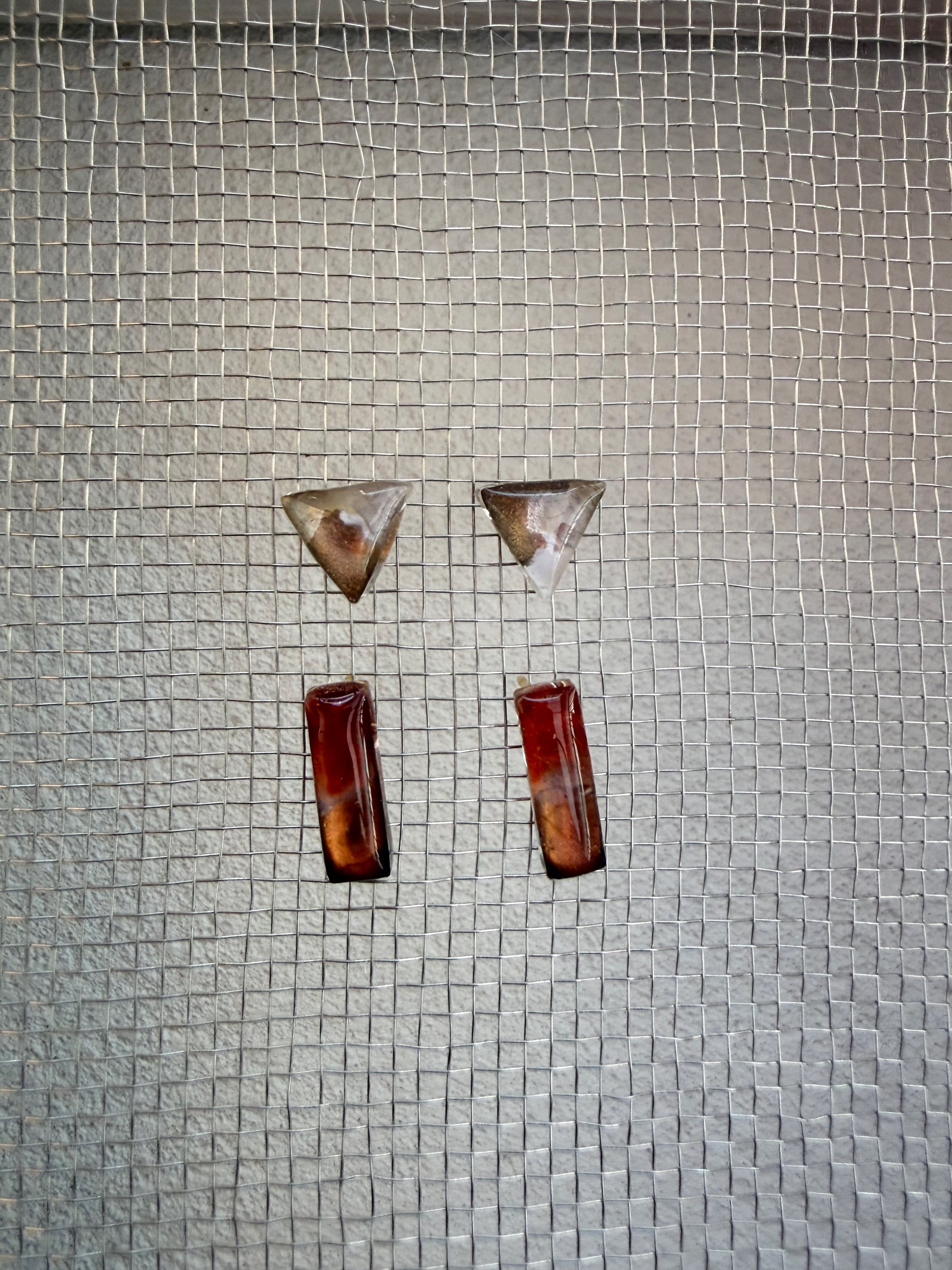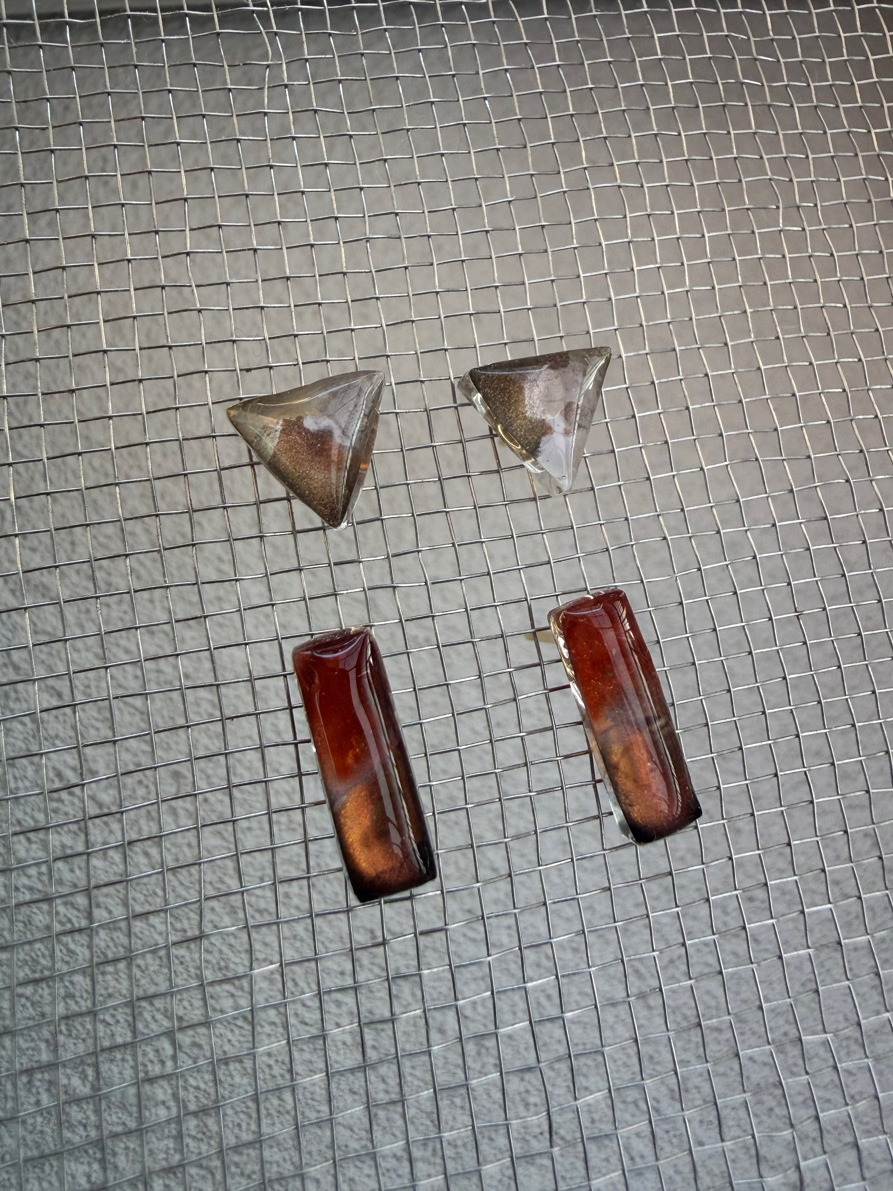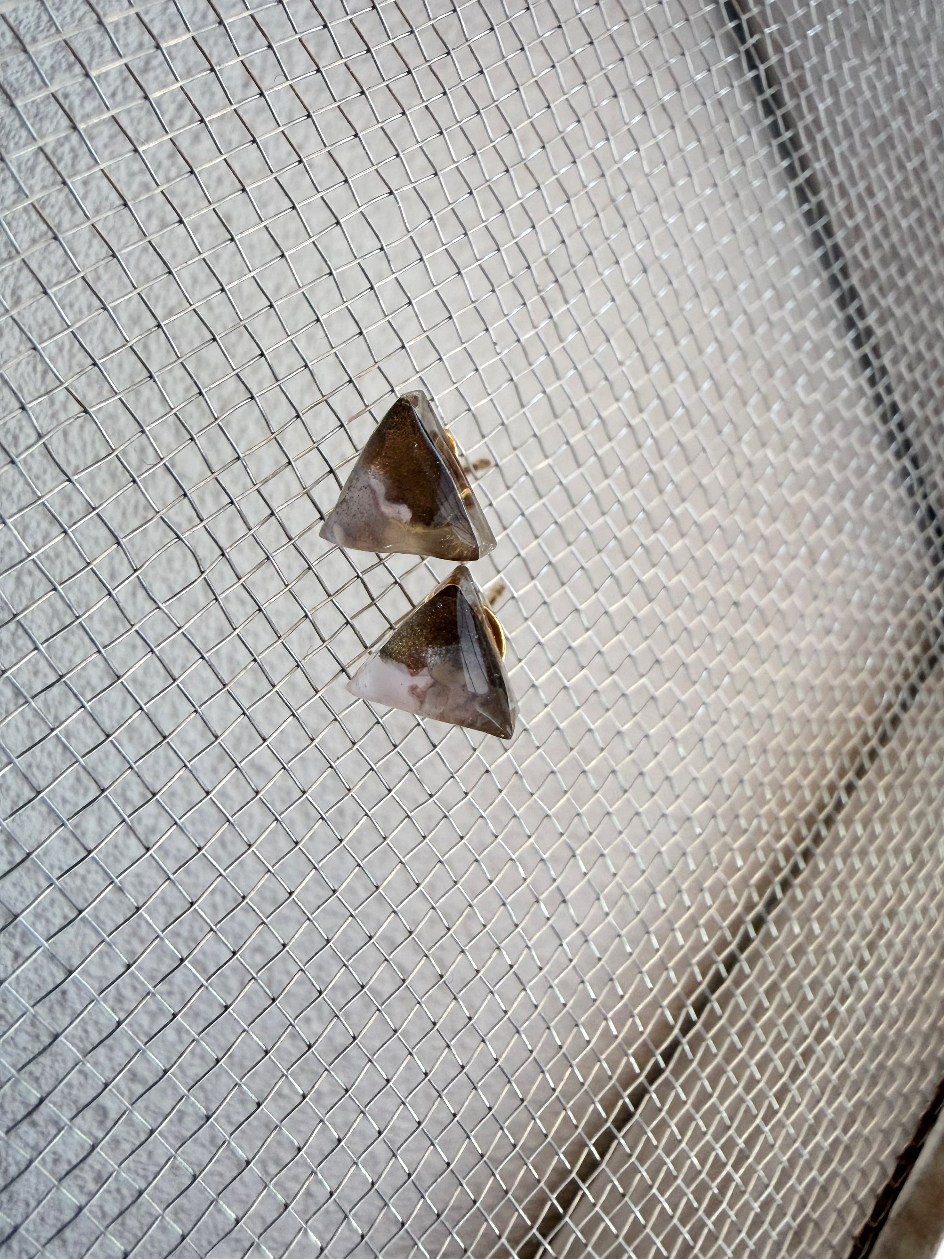 ブラウン×ベージュ系カラーが混ざり合う奥深いデザインが特徴の、ドロップ型レジンピアス。